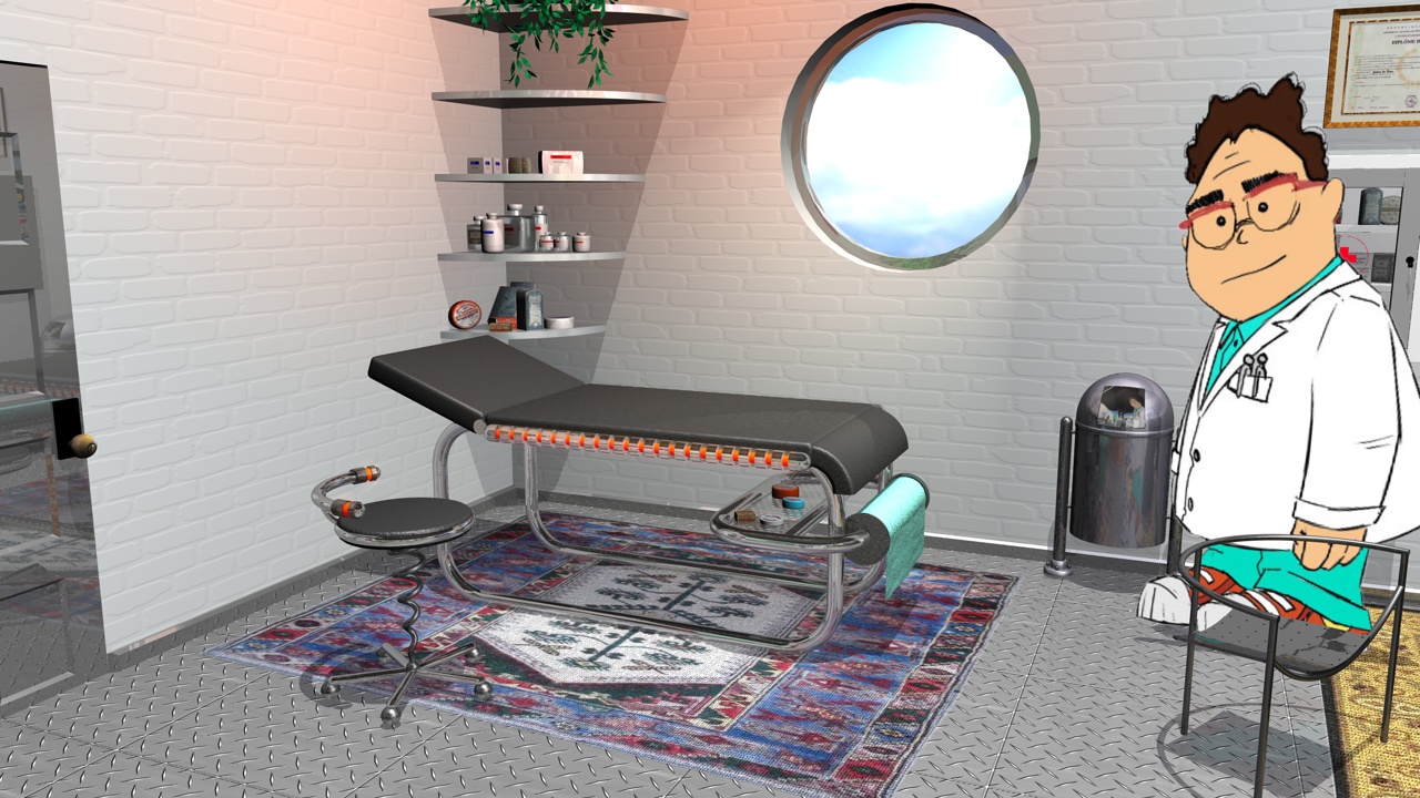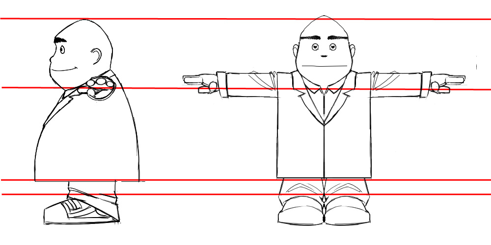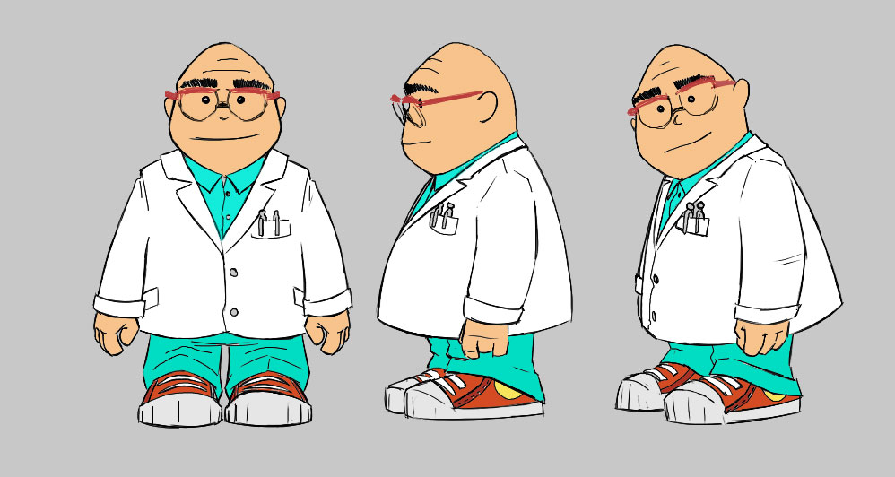 Je commence donc par faire appel à mon pote Marty (donc le site de pin-up est là, je vous le rappelle), et lui demande de me gribouiller un petit docteur rondouillard, avec les bases que j’avais apportées au producteur.